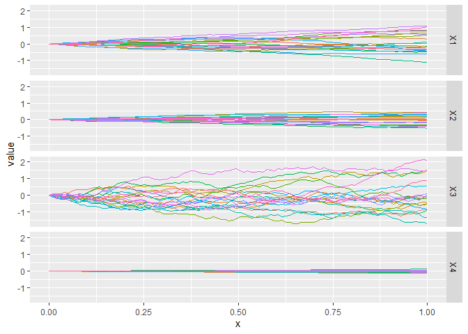 CGGPplotcorr gives an idea of what the correlation structure in each dimension is. The values plotted do not represent the actual data given to CGGP. Each wiggly line represents a random Gaussian process drawn using the correlation parameters for that dimension from the given CGGP model. Dimensions that are more wiggly and have higher variance are the more active dimensions. Dimensions with nearly flat lines mean that the corresponding input dimension has a relatively small effect on the output.