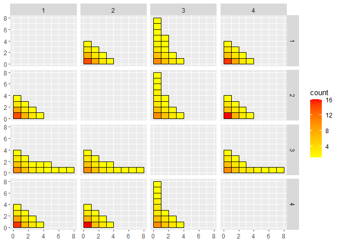 CGGPplotblocks shows the block structure when projected down to all pairs of two dimensions. The plot is symmetric. The facet labels be a little bit confusing. The first column has the label 1, and it looks like it is saying that the x-axis for each plot in that column is for X1, but it is actually the y-axis that is X1 for each plot in that column.