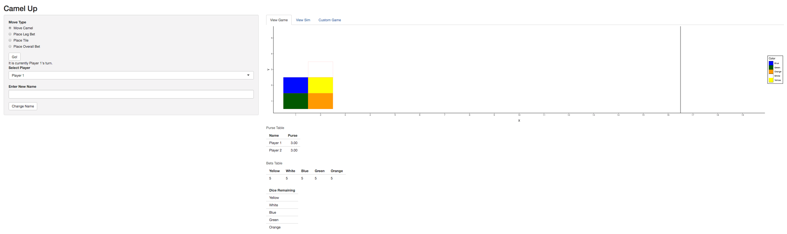 devtools::install_github("mczekanski1/Camel-Up/camelUp")The main function of this package is to allow the user to run this game locally. We have exported all of the objects in case the user would like to make use of them, but the main focus is on playing the game.