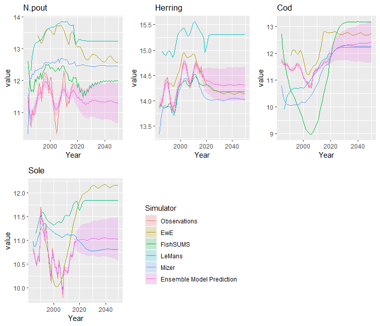 We illustrate this process with datasets included with the package. EcoEnsemble comes loaded with the predicted biomasses of 4 species from 4 different mechanistic models of fish populations in the North Sea. It also includes statistical estimates of the biomasses from single-species stock assessments, and covariances for the model outputs and assessments. The models are run for different time periods and different species.