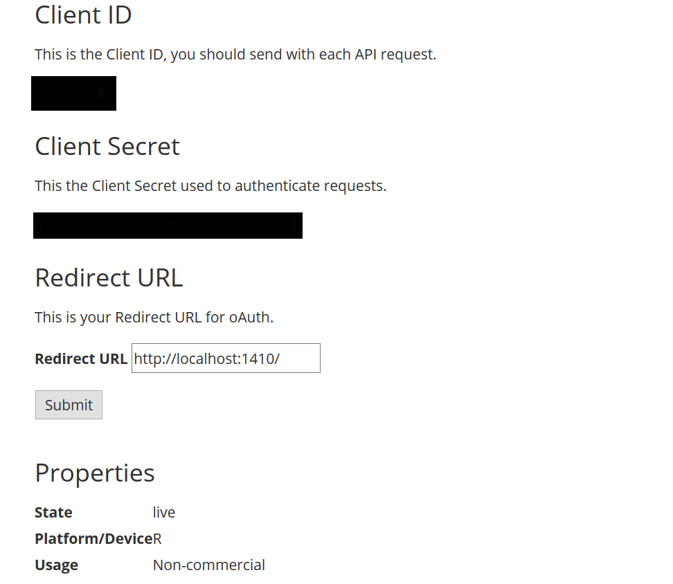 For certain functions and applications, you’ll need to be logged in. To do this, your Jamendo application needs to have a callback url. You can set this to whatever you want, but a good default option is http://localhost:1410/ (see image below). For more information on authorization, visit the offical Jamendo Developer Guide.