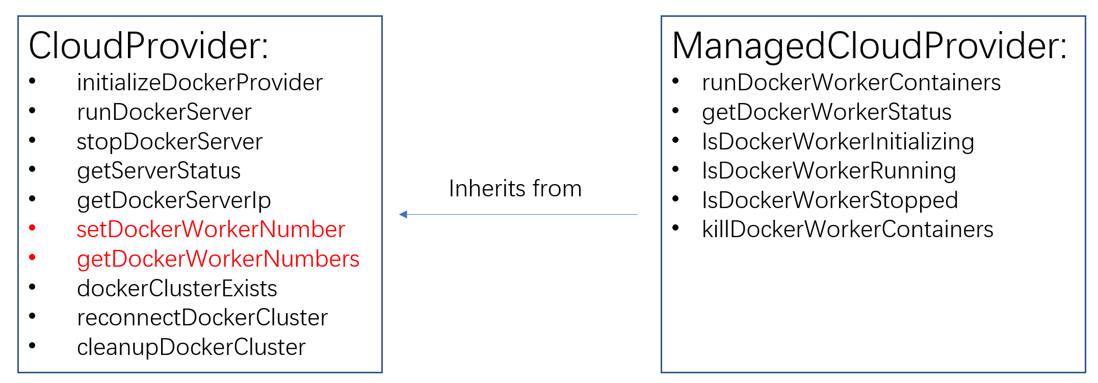 where CloudProvider is the base class defined in DockerParallel package. CloudProvider dose nothing but define a few generics(the virtual class in C++ language) .ManagedCloudProvider inherits from CloudProvider, it takes over the control of the worker container by defining the method for setDockerWorkerNumber and getDockerWorkerNumbers(The red font). The provider who inherits from ManagedCloudProvider does not need to manage the workers itself, it only needs to define the method for the generics exposed by ManagedCloudProvider, namely