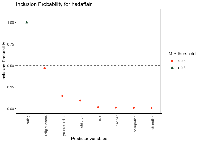 results <- ssvs(data = Affairs, x = predictors, y = outcome, continuous = FALSE, progress = FALSE)Now the results can be summarized or visualized in the same manner.