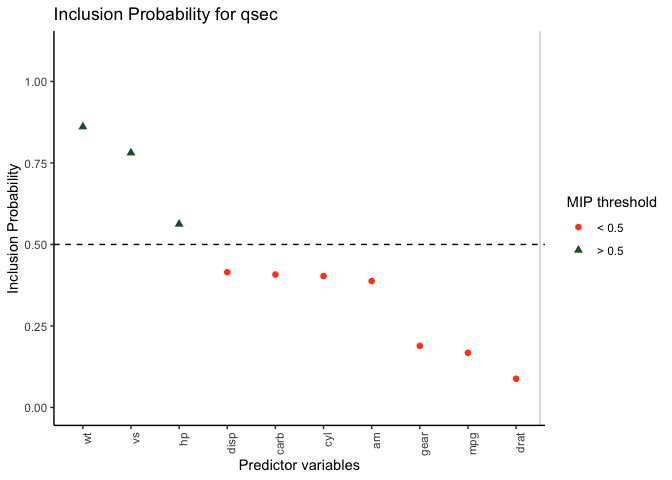 results <- ssvs(data = mtcars, x = predictors, y = outcome, prior.probs = .5, progress = FALSE)The results can be summarized and printed using the