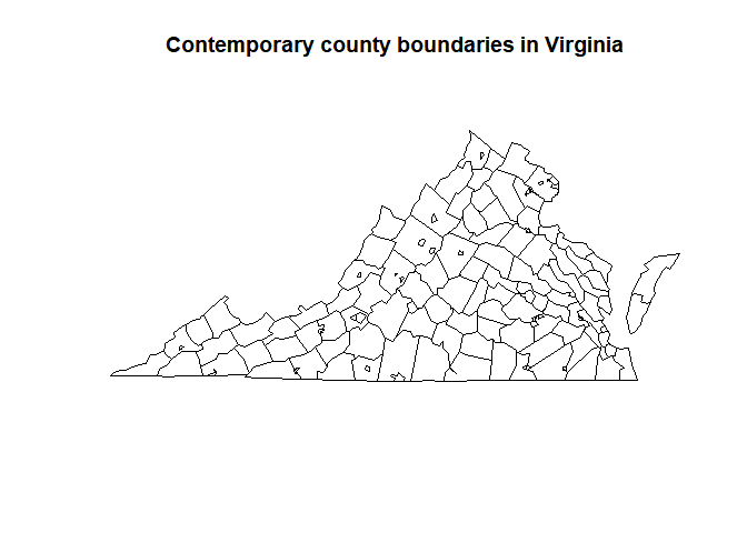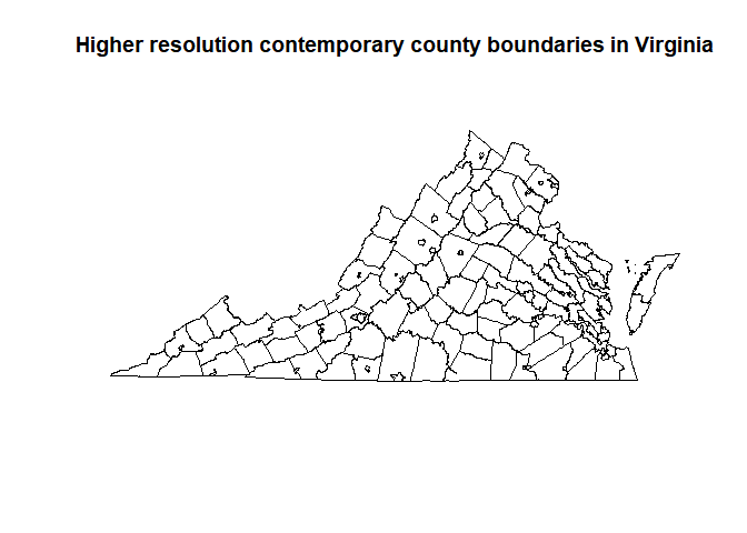 title("Higher resolution contemporary county boundaries in Virginia")