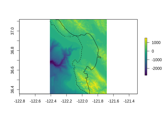 contour(mapped, levels = -10, lty = 2, add = TRUE)