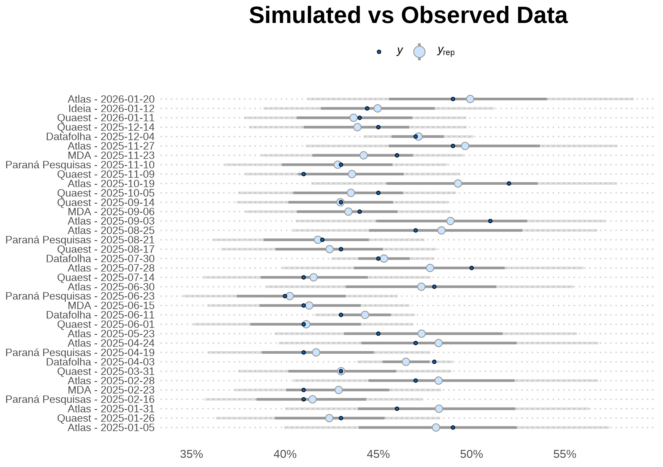 grafico_agregador(result, config_grafico = config_custom)We are interested in performing inference on the latent state of public opinion: the dynamic, unobserved level of support for each candidate. Polls are periodic snapshots of this state, but the pictures are distorted and grainy.