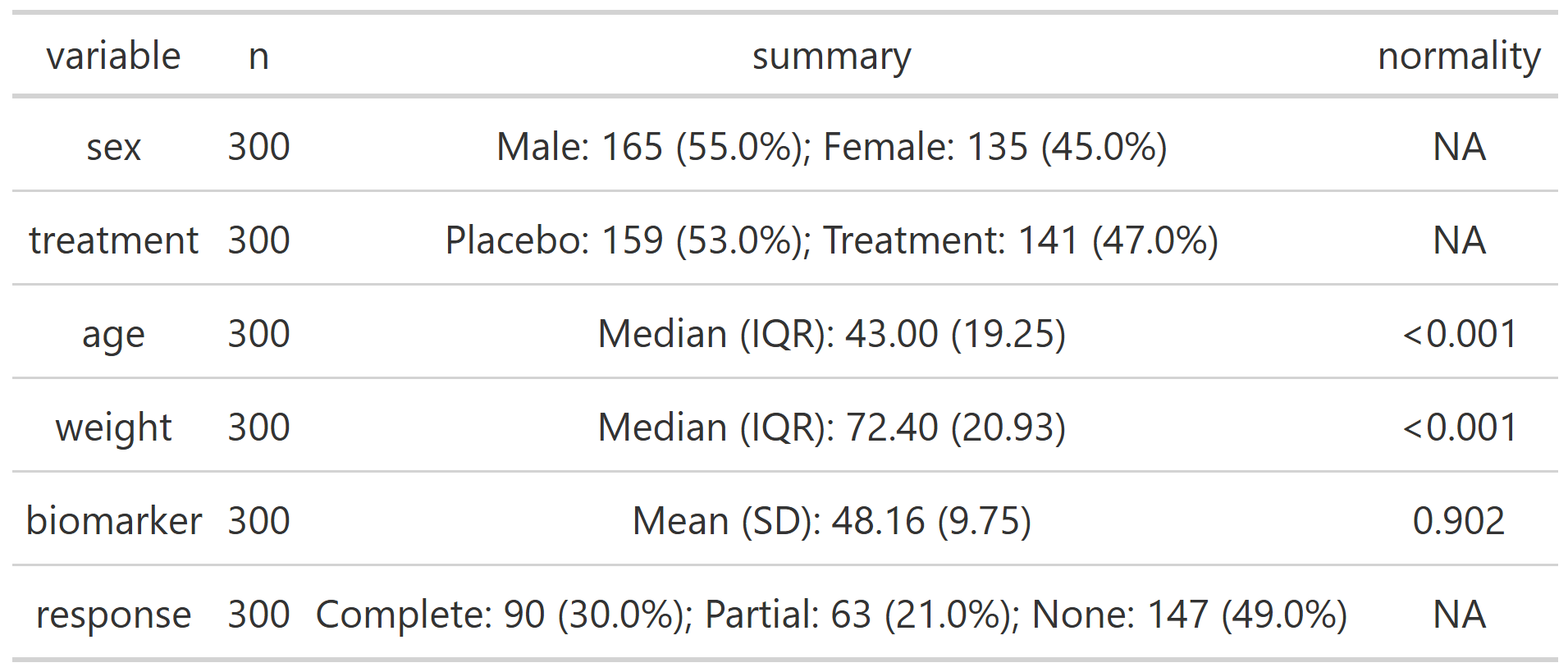 #> 20 002 10 Female B 72 NA NA <NA>Generates a summary table for biostatistics and clinical data analysis with automatic normality, effect size, and statistical test calculations. Handles both numeric and categorical variables, performing appropriate descriptive statistics and inferential tests for single-group summaries or two-group comparisons.