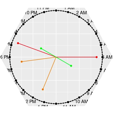 A novel visualization technique for plotting timestamped events on a 24-hour circular clock face. The clockplot package helps you uncover daily patterns, event clusters, and gaps in your temporal data.