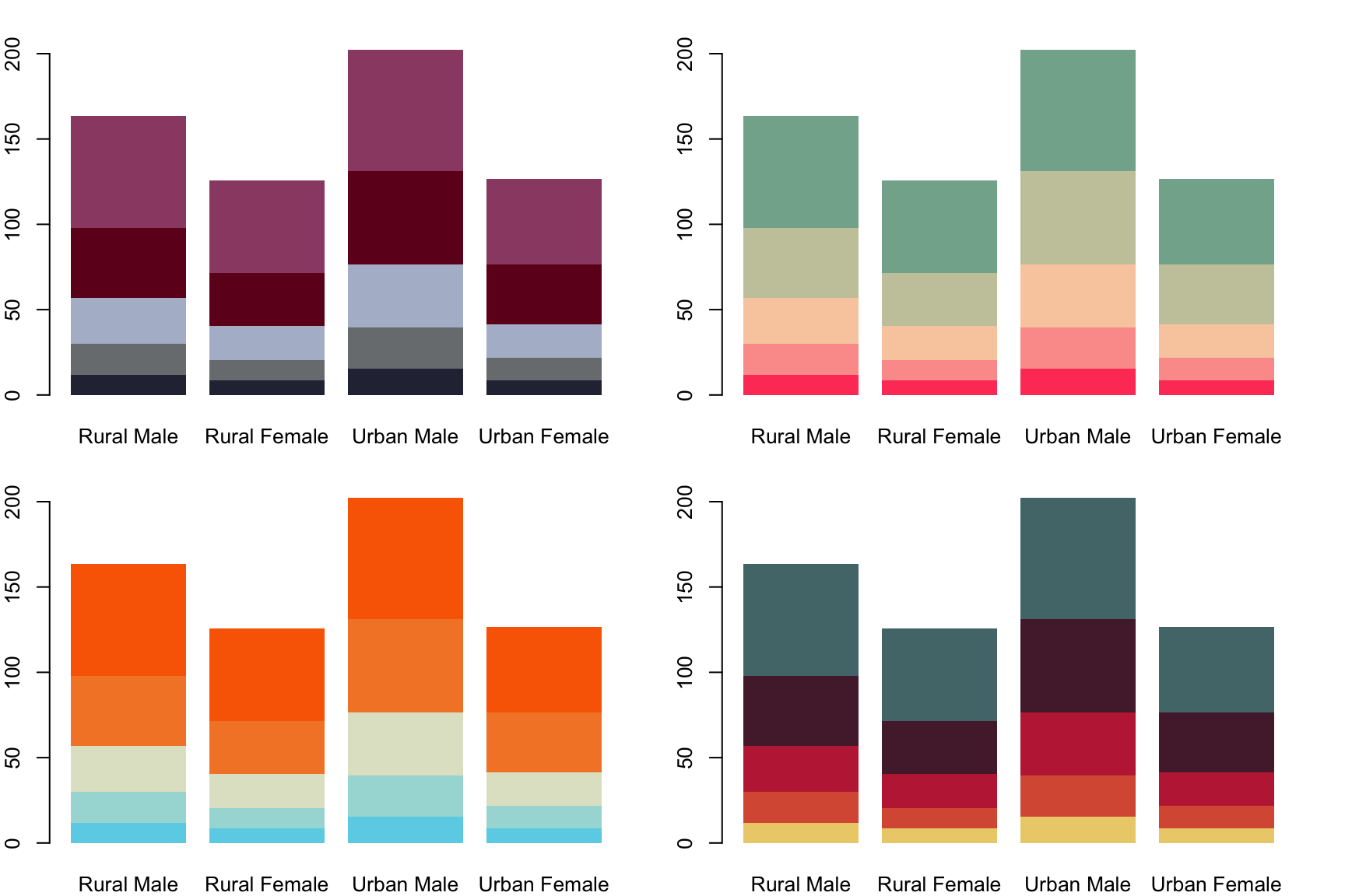 barplot(VADeaths, col = swatch(palette4)[[1]], border = NA)