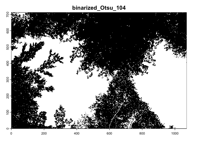 The function returns a dataframe of classified pixels into ‘Canopy’, ‘Small_gap’ and ‘Large_gap’ classes. ‘Var1’>0 identify each gap region, ‘Freq’ is the number of pixels in each gap, while ‘NR’ is the image size.