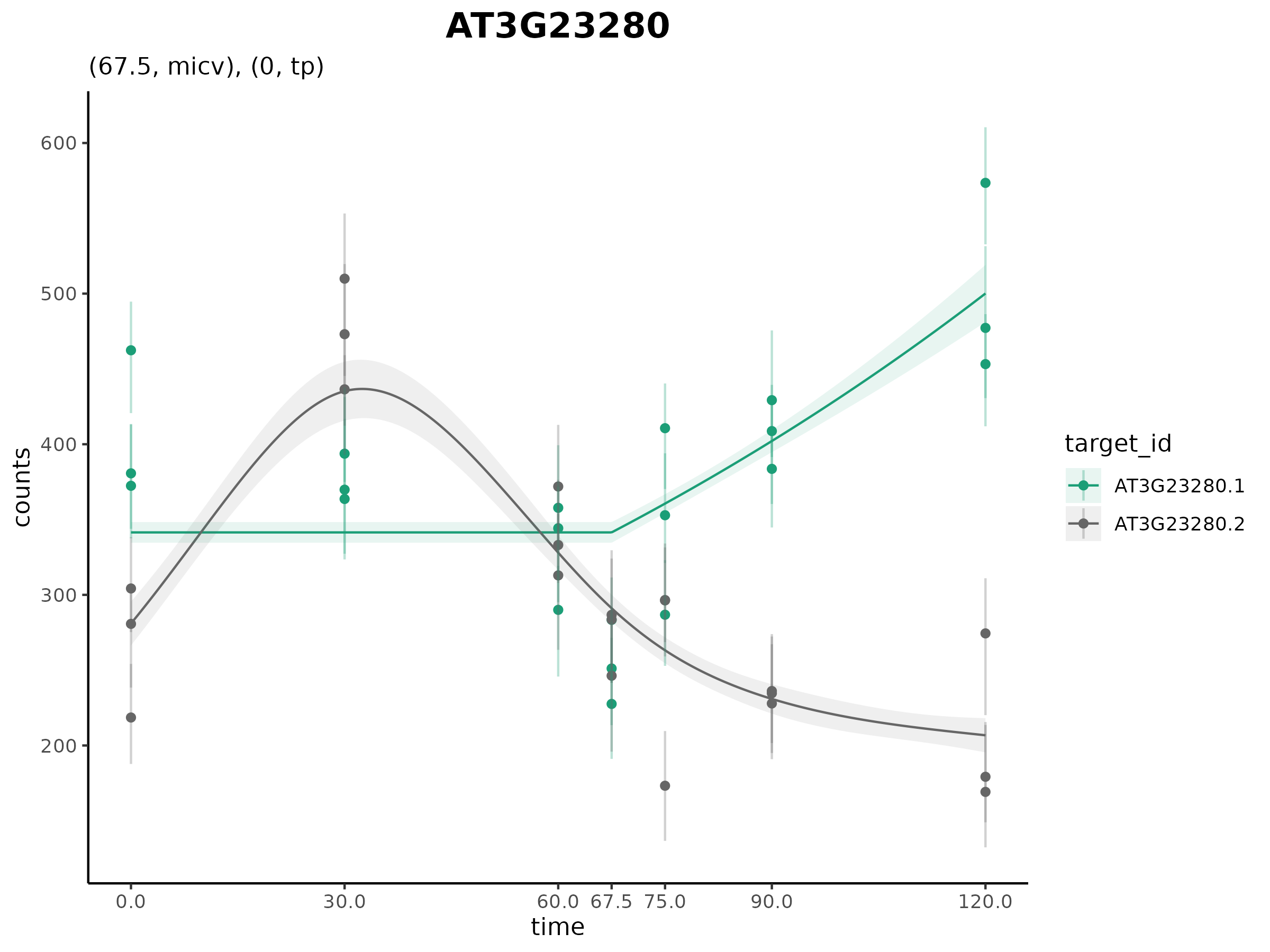Isoform 1 (AT3G23280.1) has a changepoint at 67.5 min and has a