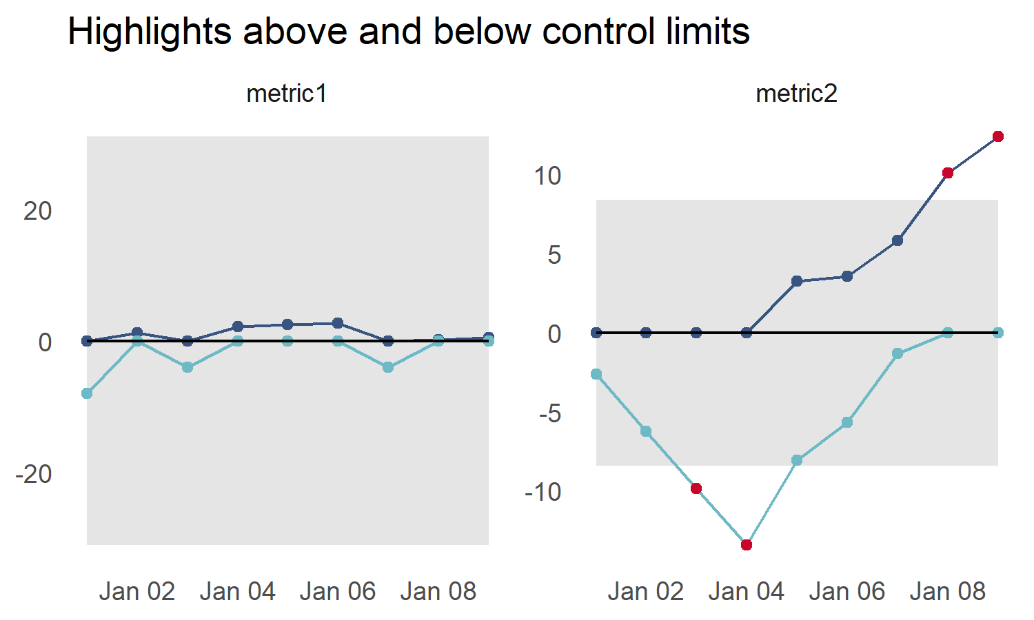 Points outside the Upper Control Limit are always highlighted. Use the show_below option to enable highlighting points below the Lower Control Limit