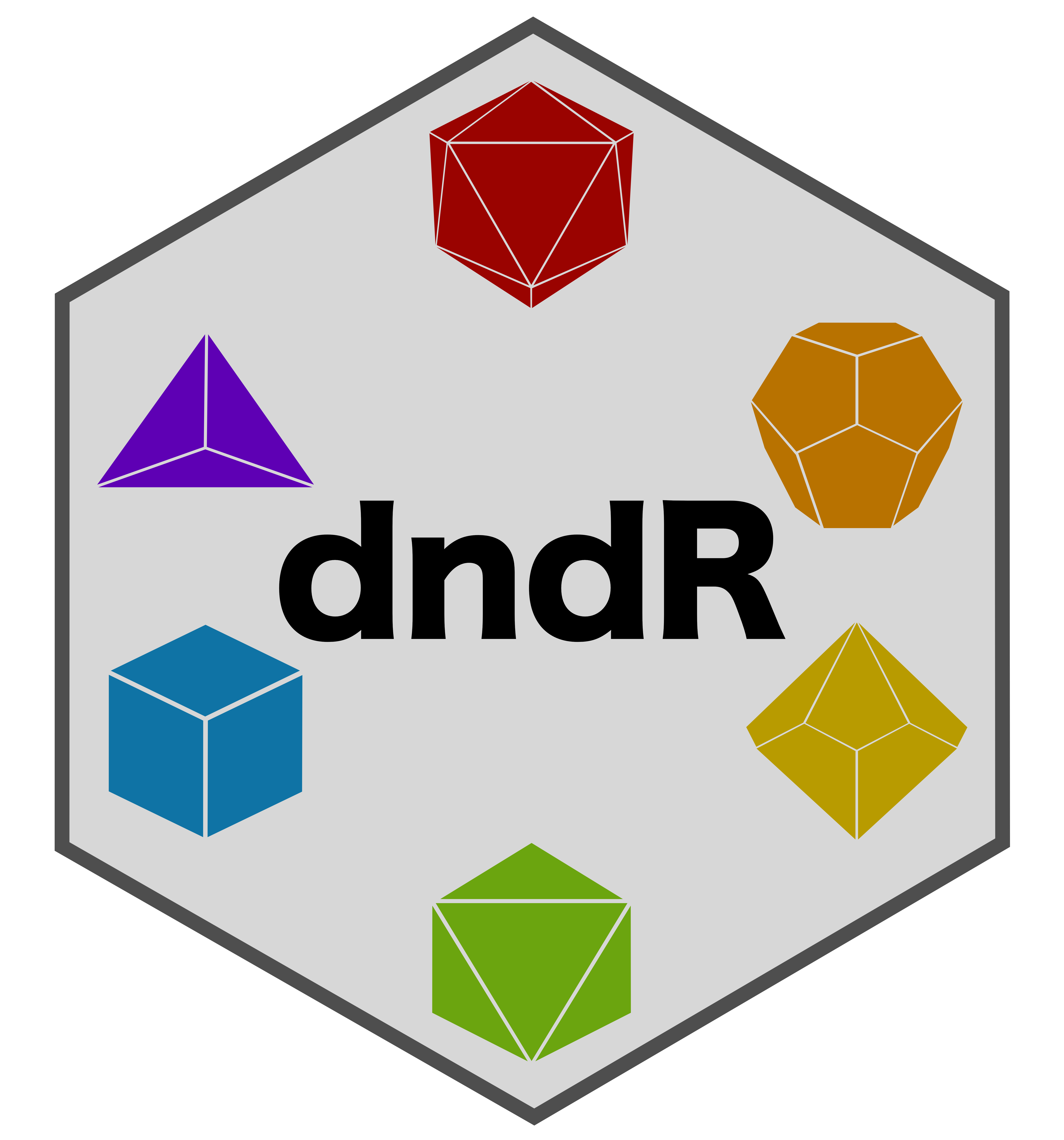 The goal of dndR is to provide a suite of Dungeons & Dragons (Fifth Edition a.k.a. “5e”) related functions to help both players and Dungeon Masters (DMs). Check out the package website (njlyon0.github.io/dndR) for documentation of the functions currently included in the package. I am always willing to expand that list though so if you have a D&D-related task that could be cool as a function, please review the contributing guidelines on how to share your idea!