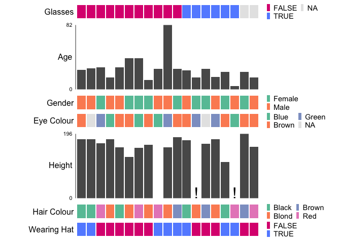Effortlessly visualize all columns in a data frame with vertically aligned plots and automatic plot selection based on variable type. Plots are fully interactive, and custom tooltips can be added.