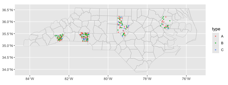 geom_geoscatter(aes(colour = type), size = 0.5) +