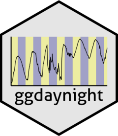 ggdaynight is an R package that adds a day/night pattern to ggplot2 plots. Daytime is represented by rectangles filled with a specified day_fill color and nighttime by rectangles filled with a specified night_fill color. The pattern is created along the x-axis, which must be a datetime variable.