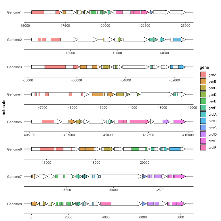aes(xmin = start, xmax = end, y = molecule, fill = gene, label = gene)