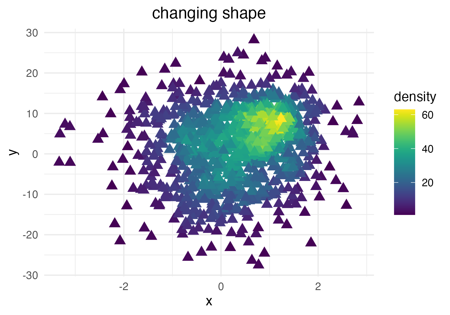 There are several ways to visualize data points on a 2D coordinate system: If you have lots of data points on top of each other, geom_point() fails to give you an estimate of how many points are overlapping. geom_density2d() and geom_bin2d() solve this issue, but they make it impossible to investigate individual outlier points, which may be of interest.