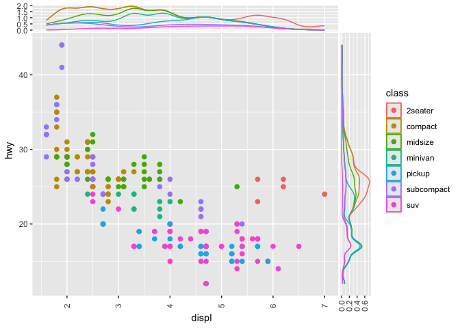 Using this package is similar to adding any additional layer to a ggplot. All geometries supported by ggside follow a pattern like geom_xside* or geom_yside* which will add that geometry to either the x side panel or the y side panel respectively. If you add geom_xsidedensity to a plot, then this places a density geometry in its own panel that is positioned by default above the main panel. This panel will share the same x axis of the main panel but will have an independent y axis. Take the following example from the ggplot2 readme.