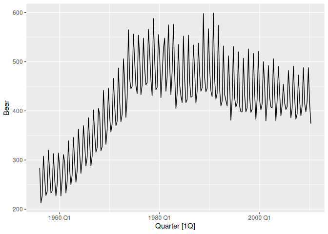 The simplest time series visualisation is the time plot, which shows time continuously on the x-axis with the measured variables on the y-axis. A time plot is useful for identifying patterns that persist over a long period of time, such as trends and seasonality. A time plot can be created from a tsibble with the autoplot() helper function.