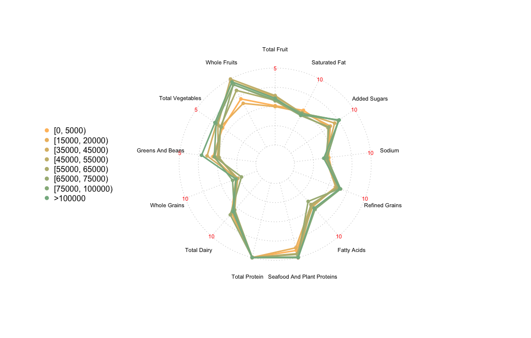 The heiscore package aims to increase the accessibility of evaluating a population’s dietary habits using the Healthy Eating Index (HEI) and enable straightforward comparisons of the diet quality of different demographic subgroups. It allows users with minimal technical experience to obtain preloaded dietary recall data from the National Health and Nutrition Examination Survey (NHANES) and use it calculate HEI scores that are representative of the U.S. population using three distinct methods prescribed by the National Cancer Institute. Additionally, heiscore includes functions that visualize this multidimensional diet quality data via various graphing techniques including histograms, bar charts, and radar charts. These plots facilitate clear comparisons of dietary patterns between sub-populations in the U.S. and across several years.