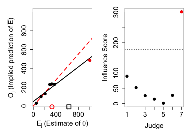 The function call also produces two plots. The left plot is a scatter plot of the judges’ estimates against the judges’ implied predictions of others. This plot includes regression lines both with (solid black) and without (dashed red) the exceptionally influential judges. All exceptionally influential judges are shown in red. The knowledge-weighted estimate is shown both with (black square) and without (red circle) exceptionally influential judges. The right plot shows the judges’ influence scores. All exceptionally influential judges are shown in red. The dashed horizontal line represents the threshold, defined as the user-defined cutoff value x the interquartile range of all influence scores.