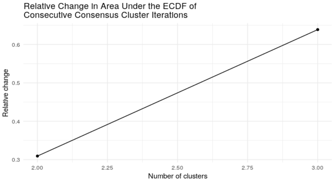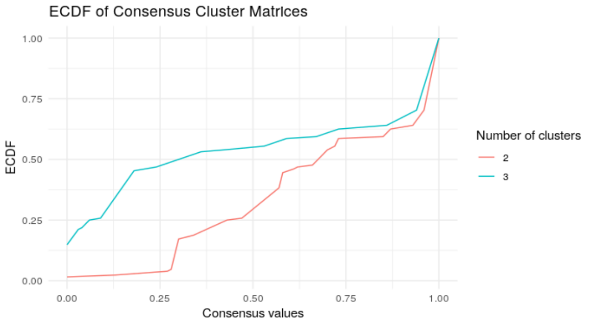 Finally, the results of the consensus clustering are visualized to identify the stable clusters of variables in the heatmap. The consensus matrices are presented first, followed by the ECDFs of the consensus matrices and finally the relative change in ECDF of consecutive iterations of the consensus clustering algorithm.