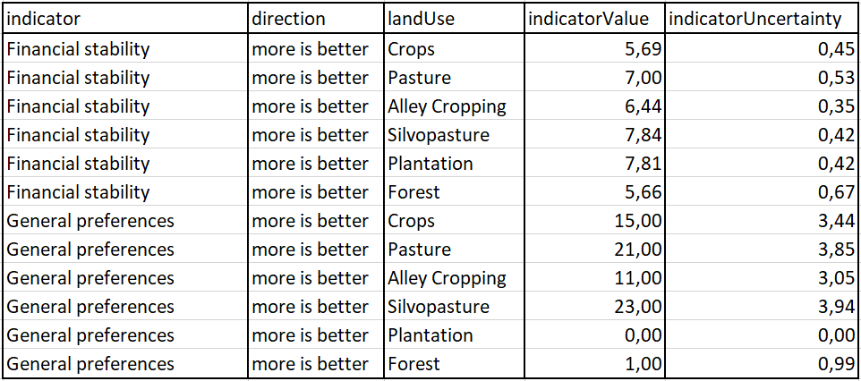 | indicator | outcomeCrops | outcomePasture | outcomeAlley Cropping | outcomeSilvopasture | outcomePlantation | outcomeForest | direction | performance |