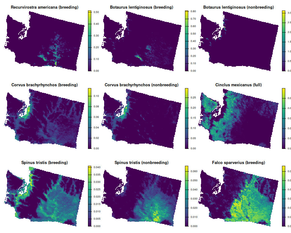 Next, we will use the get_wa_features() function to import the conservation feature data. Although the prioritizr R package can support many different types of feature data, here our feature data are represented as a multi-layer raster (i.e., terra::rast() object). Each layer describes the spatial distribution of a feature. Here, our feature data correspond to different bird species. To account for migratory patterns, the breeding and non-breeding distributions of species are represented as different features. Specifically, the cell values denote the relative abundance of individuals, with higher values indicating greater abundance.