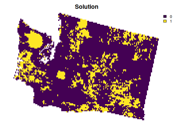 Now, let’s generate a spatial prioritization. To ensure feasibility, we will set a budget. Specifically, the total cost of the prioritization will represent a 5% of the total land value in the study area. Given this budget, we want the prioritization to increase feature representation, as much as possible, so that each feature would, ideally, have 20% of its distribution covered by the prioritization. In this scenario, we can either purchase all of the land inside a given planning unit, or none of the land inside a given planning unit. Thus we will create a new problem() that will use a minimum shortfall objective (via add_min_shortfall_objective()), with relative targets of 20% (via add_relative_targets()), binary decisions (via add_binary_decisions()), and specify that we want near-optimal solutions (i.e., 10% from optimality) using the best solver installed on our computer (via add_default_solver()).