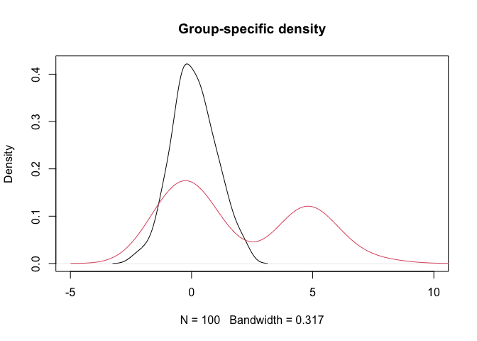 plot(density(y[g==1]), xlim = c(-5,10), main = "Group-specific density")
