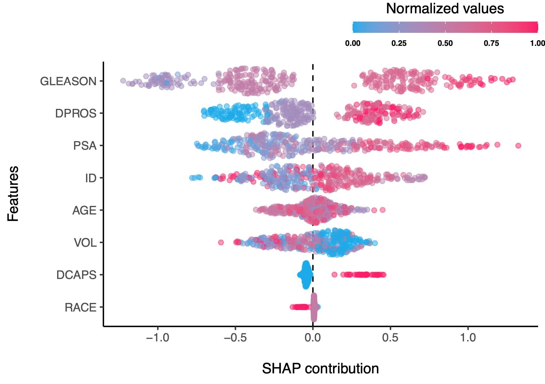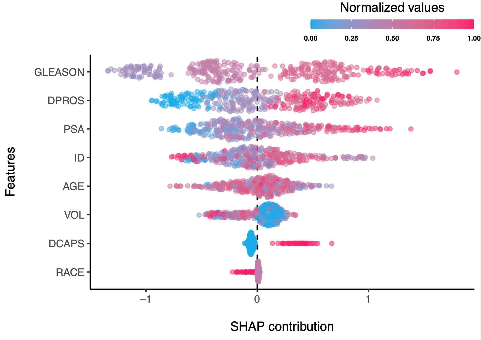 difference in SHAP contributions between the “GLEASON” and “DPROS”