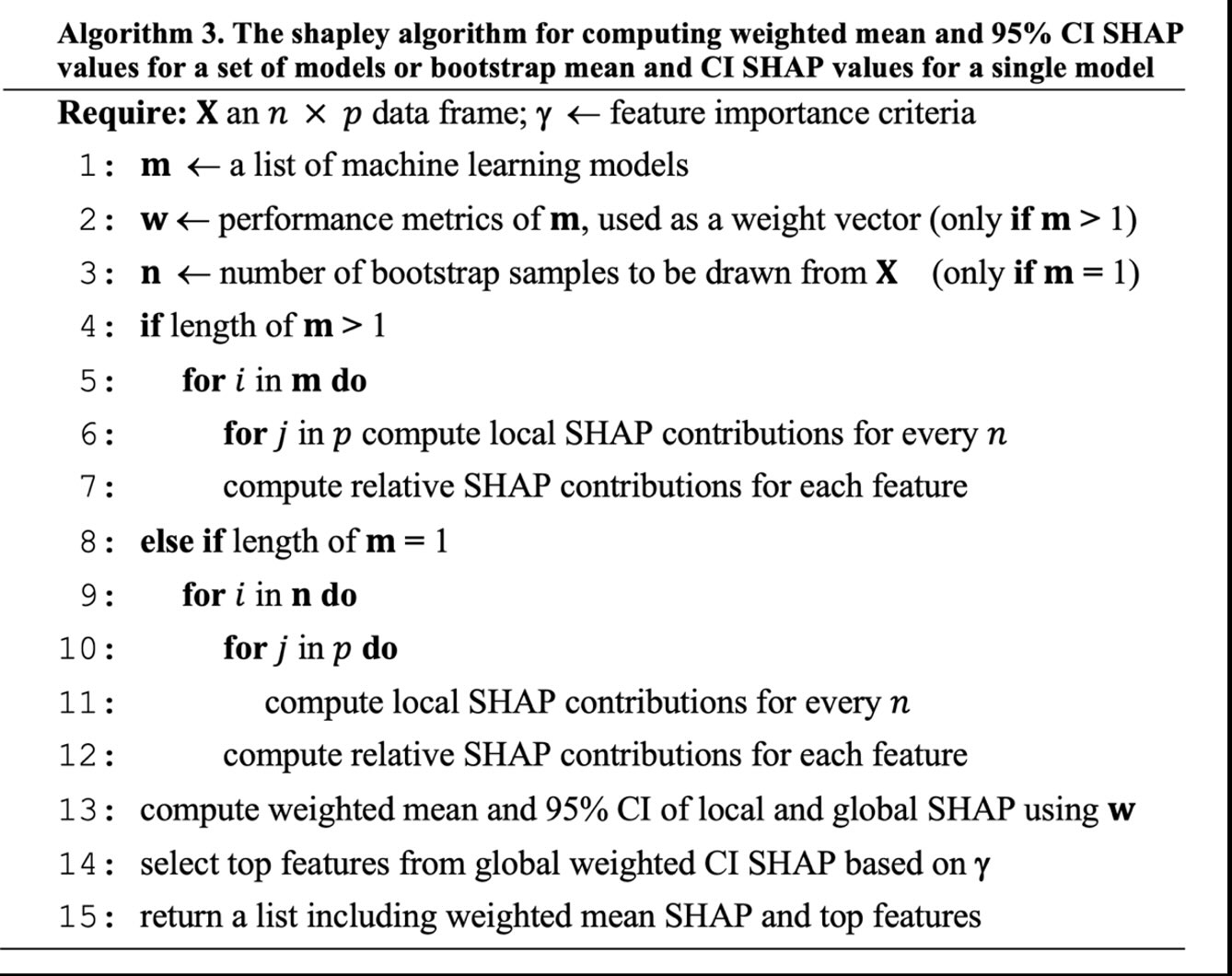 The shapley algorithm computes weighted mean SHAP values and their 95% confidence intervals for a set of homogeneous or heterogeneous machine learning models. The algorithm also computes mean and 95% confidence interval bootstrap SHAP values for a single model. Local SHAP values are at subject level (n) and global SHAP contributions are at feature level (p).