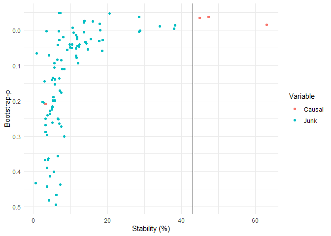 To attempt to identify which variables are truly “causal” in this dataset using a selection stability approach, use the stabilise() function as follows: