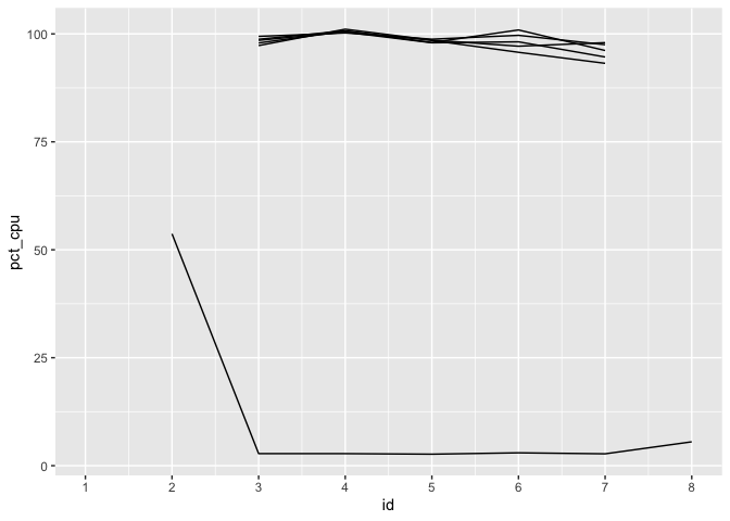 At first, only the parent process has non-NA rss, as tidymodels hasn’t sent data off to any workers yet. Then, each of the 5 workers receives data from tidymodels and begins fitting models. Eventually, each of those workers returns their results to the parent process, and their rss is once again NA. The parent process wraps up its computations before completing evaluation of the expression, at which point syrup() returns. (Keep in mind: memory is weird. In the above plot, the total memory allotted to the parent session and its five workers at each ID is not simply the sum of those rss values, as memory is shared among them.) We see a another side of the story come together for CPU usage: