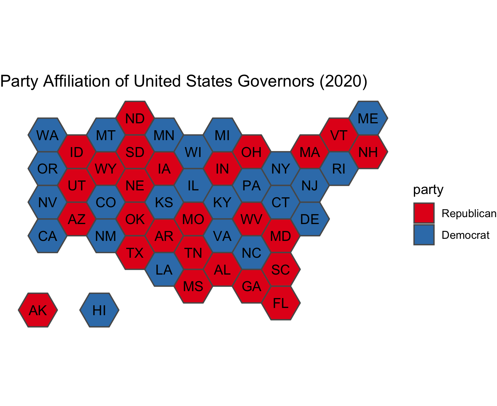 ggtitle("Party Affiliation of United States Governors (2020)") +