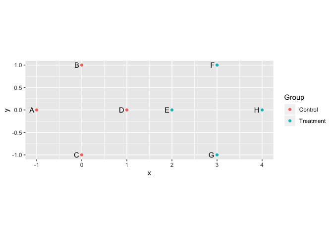 You can use the Pythagorean theorem to check that the other distances are correct. The distance between point “G” and the centroid for the Control group should be sqrt(32 + 12) = sqrt(10) = 3.162278.