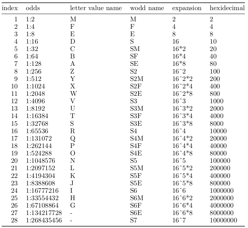 The goal of wodds is to make the calculations of whisker odds (wodds) easy. Wodds follow the same rules as letter-values, but with a different naming system.