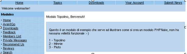 ![]() | Before making anything it's necessary to create a folder called "modules/Topolino", the file we have just created (with the other contents) must be called index.php and must stay in that folder. |