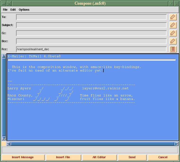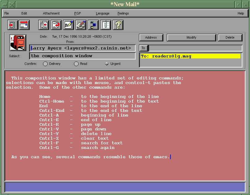Some months ago John Fisk wrote about the XFmail program in the Gazette. His account inspired me to try it out, but I had quite a few problems with the message editing window, so much so that when I tried to mail the developers a comment on their program, the message was corrupted and I doubt that it was legible to them. I gave up and deleted it soon after, making a mental note to check it out later when perhaps it had become more usable.