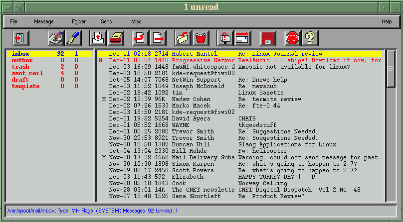 Among the other features of this mailer are an internal address book, full MIME support, and support for faces and picons. Support is planned for compatibility with mailx-style mail-folders.