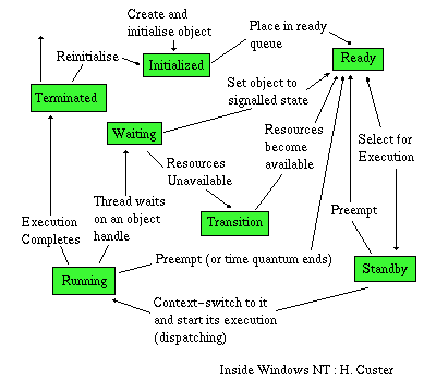 | Waiting : interruptable : The process is waiting for a resource or event but signals are not blocked and it may be interrupted. | Ready : The thread is simply waiting to execute and is a candidate for selection by the scheduler for entering standby at the next scheduling cycle. | |