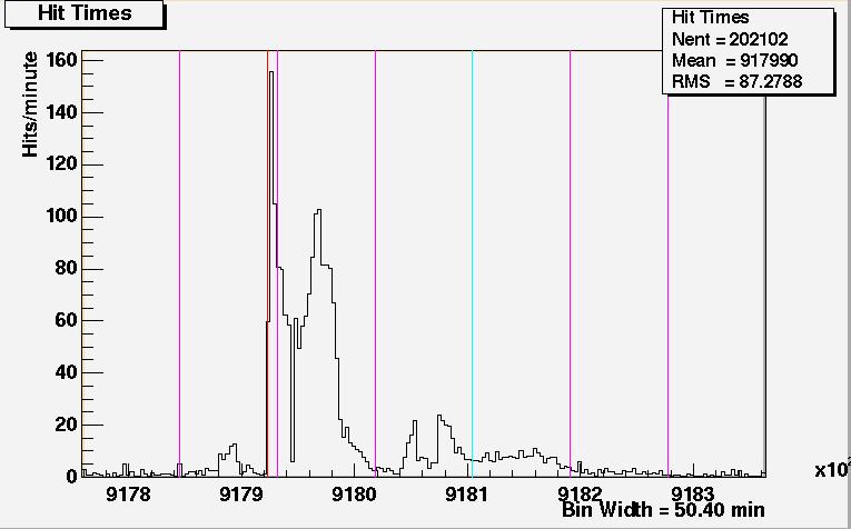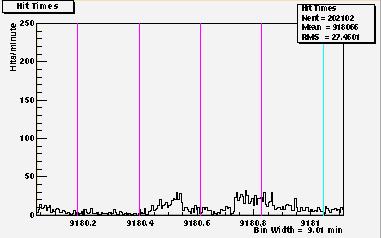 What follows is a table of plots of the same data but on a finer time scale. (9 min/bin as opposed to 50 min/bin in the plot in Figure 1.) The purpose is for one to better study the data. The purple lines are now time marker on 6 hour intervals. The limits on the time axis overlap between plots to help the reader follow the continuity of the data. Because of binning effects, the overlap regions of the data from one plot to the next look slightly different, and this dissimilarity should be ignored.