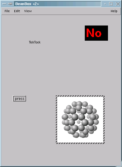 The ToolBox initially contains a number of example beans, you can add your own to create your own visual programming environment. Select a bean by clicking your mouse on it. Then click somewhere in the BeanBox. The javaBean will appear and a list of its properties will appear in the Properties window. You may then use the Properties window to customize the JavaBean for your application. When you have finished adding Beans, and are happy with the appearance of your application in the BeanBox you can select File/Make applet from the BeanBox windows menu and an applet complete with example html file will be generated for you.