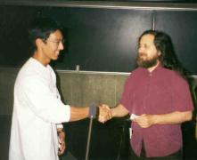 He devoted the last part of his talk to issues which must be addressed in order to ensure the continued existence of a free OS five years down the road. First up: the problem of hardware products whose specifications are kept secret by their manufacturers and that can only be operated via proprietary software. The solution to this problem is twofold: 1) discourage people from purchasing hardware that is not supported by free software, and 2) reverse engineer the non-free drivers and write free ones. Secondly, he talked about the pitfall represented by using non-free libraries as a basis for free software development. The obvious example of this is the Qt GUI toolkit used by KDE. GNU is attacking this problem by developing the GNOME desktop environment, as well as the FreeQT toolkit Harmony. Again, Stallman stressed that it is easy to stay out of this trap if you recognize it as an issue. Finally, he made brief mention of the dangers posed by patents, and the patenting of software features and algorithms (e.g. the GIF patent held by UNISYS).