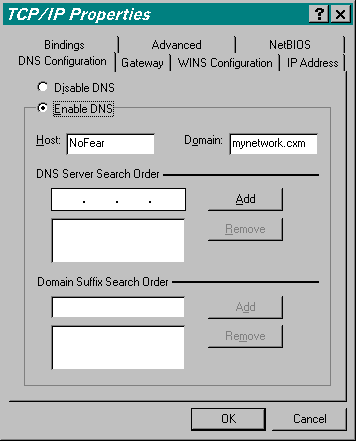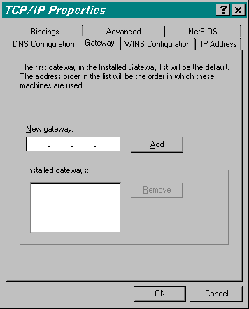 Start -> Settings -> Control Panel -> NetworkFind the `TCP/IP protocol for your network adapter'. Highlight it get to the properties window by pressing [Mouse1] on the `Properties' button. Since pictures are better than words I'll use the following 3 pictures to illustrate how your TCP/IP settings should be configured: