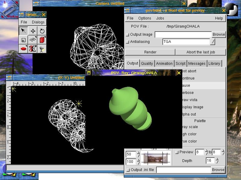 The group responsible for PovRay development organizes annuals competitions with the best images, sells CDs with images and models and has a Hall of Fame on its web site with a fantastic gallery of images. Despite of its functionality, PovRay is a line command program, so the files must be written to define each image and then proceed with renderization of each one of them. Many graphic programs were developed as Pov Ray front end as 3dPM, Giram, XPovRay and k3de.Among all of them, Giram promises to be the most popular. Check how it looks like: