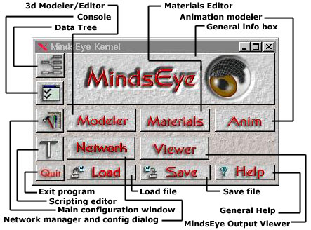 MindsEyeis a project to develop a GPL 3D program. Itīs main features are modular design, multi scene/multi user concept( where different people interact or watch a scene), vision of "kernel-system" instead of "modeler-system", object oriented modeling/designing and network support as MindsEye-kernel.