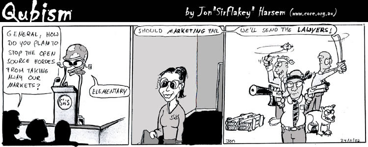 [BIO] Jon is the creator of the Qubism cartoon strip and current Editor-in-Chief of the CORE News Site. Somewhere along the early stages of his life he picked up a pencil and started drawing on the wallpaper. Now his cartoons appear 5 days a week on-line, go figure. He confesses to owning a Mac but swears it is for "personal use".